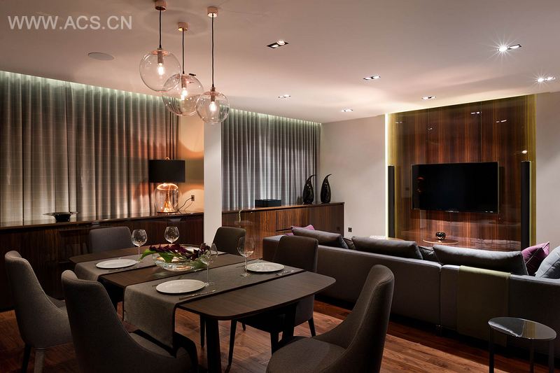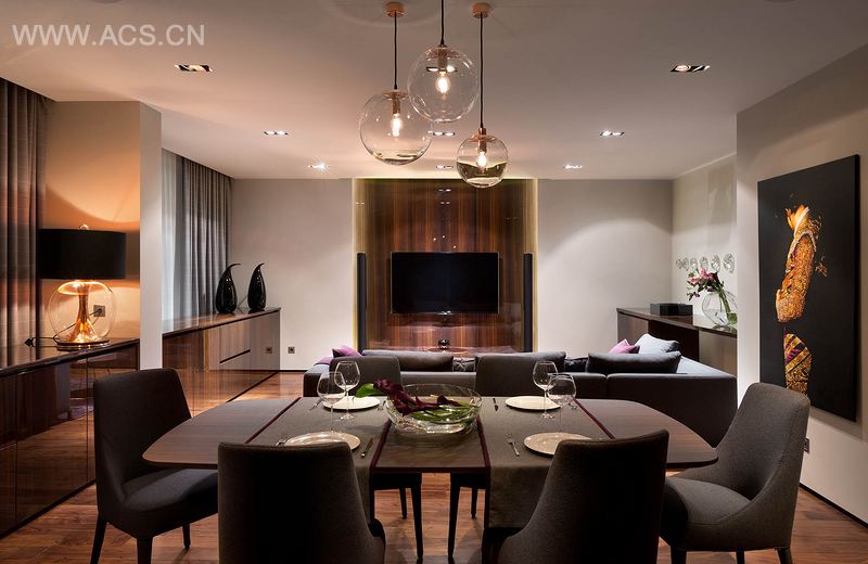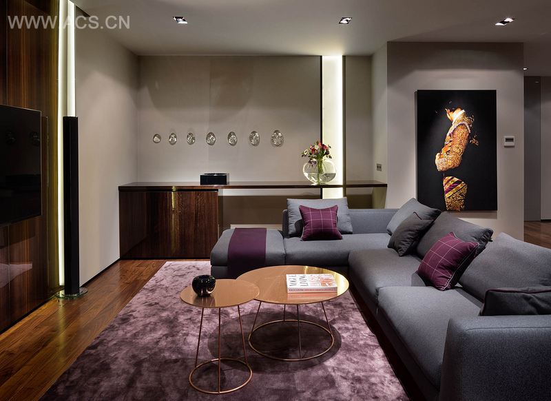 最终,项目采用了羊毛和羊绒,还有特别挑选的铜材,铜材一直是设计师喜欢的,但是客户却总是排斥铜。也许室内空间最吸引人的是木材,这些木材经过了冲刷和抛光,虽然色彩很暗,但是纹理却很美观。餐厅、厨房、客厅中的家具都是用桉木制成,与美洲胡桃木地板色调一致。为其它房间定制的家具和壁板采用了马萨胡桃木,与灰色完美地实现了平衡。它的色彩微妙而不突兀,包括柔和紫和安静蓝。这些色彩在昏暗的灯光下若隐若现,与背景完美地融合在一起,这种效果恰好又落在了蓬松的地毯上。室内的任何色彩都能吸纳新色彩,而不显得突兀。