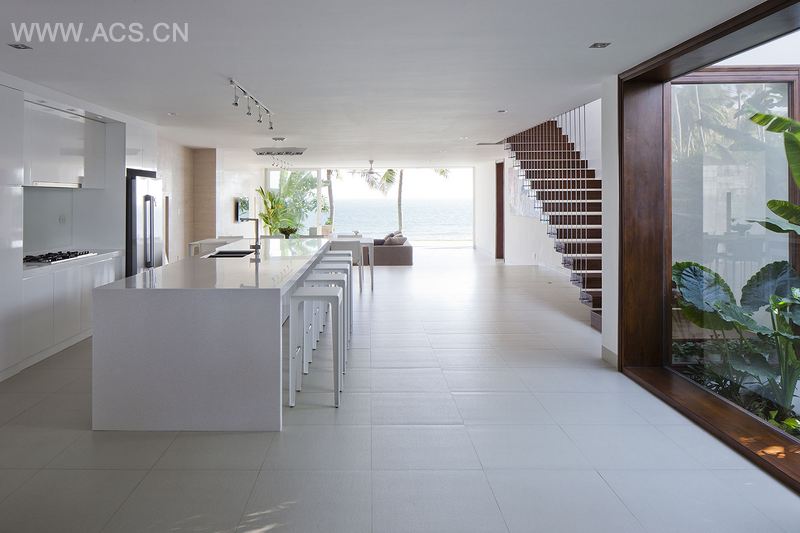 一层是厨房、餐厅和客厅,这些空间融为一体,面向海洋,背靠露台,使得空间内光线充足、自然通风,入口和楼梯设置合理有序,水池和室内热带花园更是迷人。