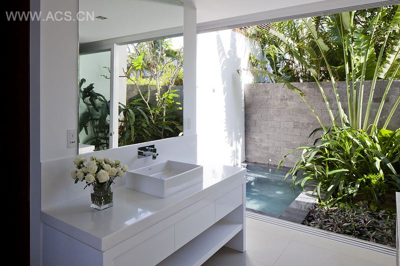 主卧室敞向无边泳池,并延伸至海洋。后方的每间浴室都带有私人花园和按摩浴缸,而且十分明亮,自然通风,实现了室内与室外空间的对接。