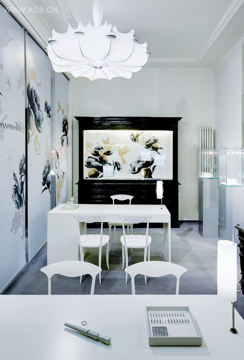 来自老商店的那件光亮的黑色古董家具被保留了下来,并用笔直的白色碎块进行修补。像Marcel Wanders吊灯和空间处理说明的设计主张,通过重新解读的已知概念、相互联系的传统精神和现代精神来形成新的印象。