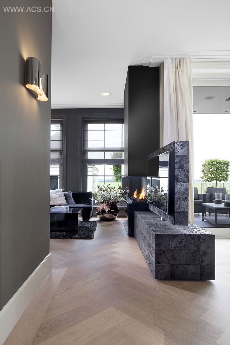 住宅坐落于荷兰北部,占地450平方米。房屋落成时,业主在房屋内举办了新居落成派对。罗伯特的室内设计有几处亮点,如 Maretti“梦幻”吊灯;地下室中则设有健身房和酒吧。主卧室处能看到“梦幻”吊灯,但当按下按钮时,玻璃落下便营造出私密的空间,这得益于创意墨色遮光玻璃的使用。