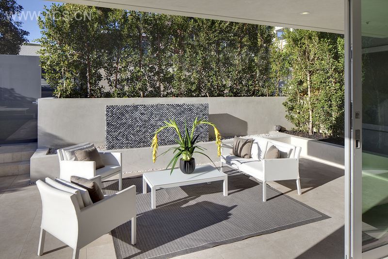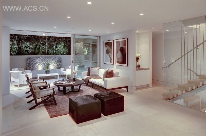 漫长而艰难的策划过程增加了项目的难度。为了不影响周围建筑的视野,此建筑四周都必需留有一定的空间,使得建筑高度、顶层位置和大小都受到了限制。因此,房屋只建了三层,顶层仅设有主要的起居空间,而大厅和主卧都设在一楼,其他的卧室朝向后院,能够欣赏到斜坡上的风景。由于空间有限,主起居区呈线型延伸,各功能区融为一体,厨房把餐厅从起居区分隔开来。厨房中设有全高白色玻璃橱柜墙,白色大理石厨房灶台提供了充足的席位和烹饪空间。空间的三面都被玻璃覆盖,增加了房屋的空间感;推开滑动弗利特伍德木门,便来到了宽敞的娱乐区,休息区和野外烧烤区都设在此处。