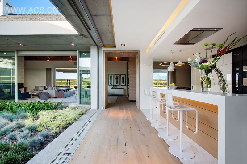 房主热爱闲适的生活,因此希望房子能体现这种生活方式。最能体现这一点的莫过于量身定做的酒窖了。设计师为酒窖设计了一道壮观的玻璃酒墙。无框玻璃酒架被橡木橱柜包围起来,至少可以容纳400瓶酒,而隐藏式的制冷系统则将温度控制到最佳状态。除此之外,玻璃酒墙还充当了正式家庭空间和非正式家庭空间之间的隔墙。正式客厅中的壁炉上镶着两倍高的大石块,与非正式客厅中的嵌入式烤炉形成对比。这些空间都与户外休闲甲板和无边水池连通着。与露台相连的是下沉式户外圈地(典型的南非户外围场),此处的户外火炉被各种休闲座椅包围着,颇为惬意。