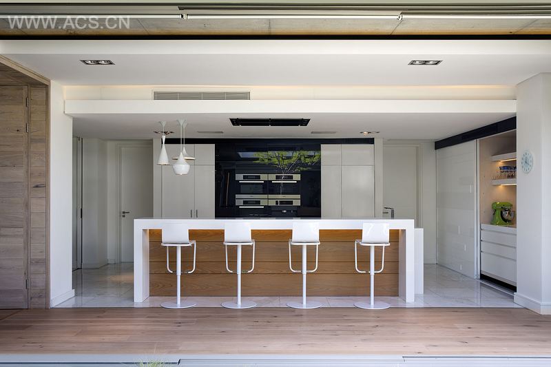 住宅的室内装潢是由Mark Rielly和Jon Case设计的。他们注重天然有机材料的使用,例如木材和石材。在这个空间中,用石灰处理过的橡木地板与蜂蜜色石墙相呼应,又与黑色的炭石、白垩色的家具形成对比。这些颇有触感的材料使这栋当代建筑更加温馨。而水景和壁炉则展示出了自然力。
