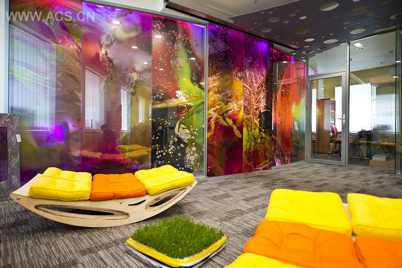 休息室采用了明亮的对比色彩。玻璃墙上贴着的照片,使 空间氛围更加轻松。