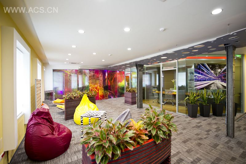办公室的主要色彩为淡黄色,当员工在工作时,不会刺激 眼睛。天花板采用了白色,而灯光可以根据场合转变色彩,比 如在展示、放松和为客户演示产品等场合时,可以营造相应的 氛围。