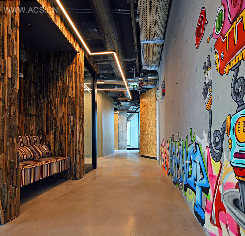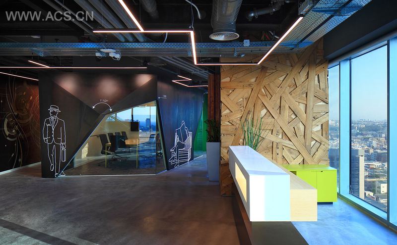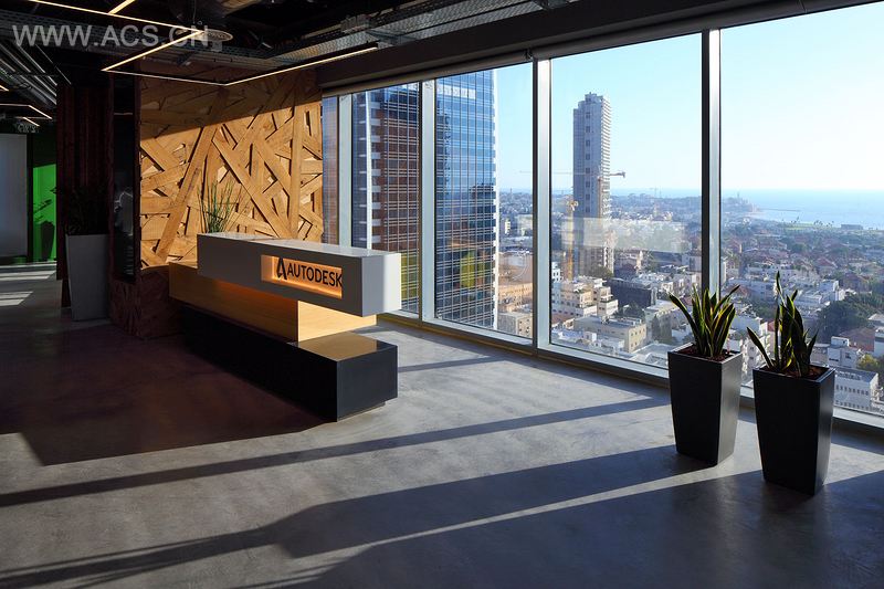 新开发中心的特色就是拥有 360°特拉维夫市现代城市风光。为此,设计目标 就是让所有职员能在办公室的任何一角欣赏到壮丽的风景。当然,室内设计中也采用 了朴素自然的工业风材料,例如混凝土地面、锈化金属墙、回收再利用的窗框木材和 石膏以及带有欧特克标志的鲜艳图纹墙纸。这些元素的有趣搭配形成了一种非凡的流