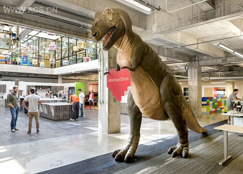 从门厅通往接待台的是一道楼梯,全面的 Chartboost 空间体验便开始于此。 此处的整个墙面都十分适合拍照。访客可以发现自己的游戏被展示出来,也可以与 这些盒子拍照(尽管我们认为高于 3.4m 的恐龙更引人注目,与它也能拍出喜爱的照 片)。这只名为“巴斯特”的恐龙是 Chartboost 的吉祥物,公司开发的首个手机内 置游戏就是“霸王龙”(T-Rex)。悬挂的应用盒以及交互式 iPad 爱心墙则是对 Chartboost 产品开发者和客户的赞美。