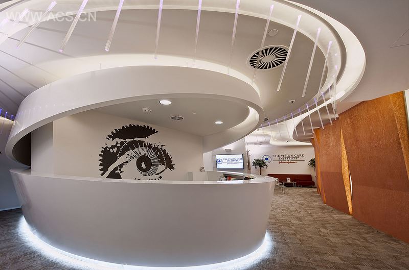 室内设计中最重要的元素是可丽耐大理石接待台, 以及醒目的有机玻璃背板,上方还有“睫毛”字样。所 有的装饰都出自建筑师的设计图,独一无二。“睫毛” 字样上有区别性的标志“+”和“-”,代表着屈光镜。