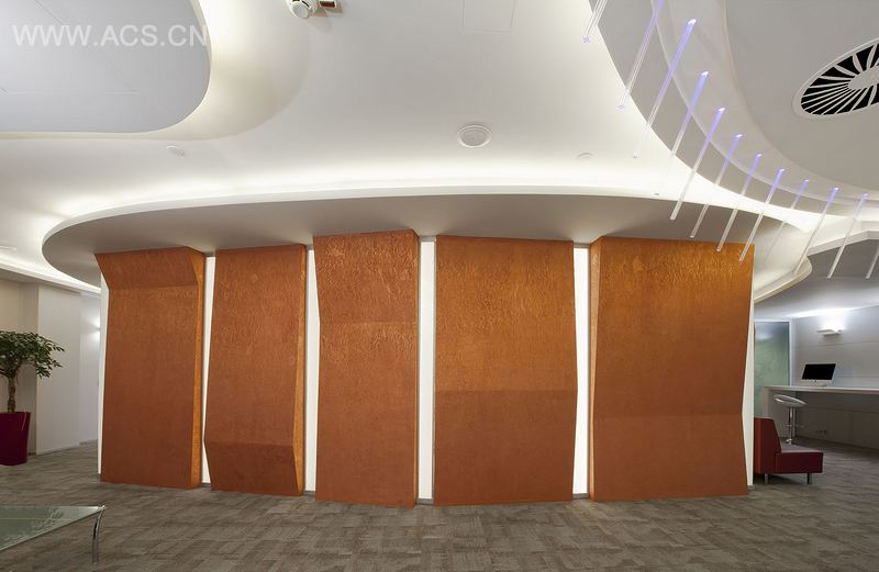 色彩方案:单色为主,彩色为辅。 由折线组合而成的活力空间,结构与众不同。 墙壁则用俄罗斯当代艺术家的作品来装饰。