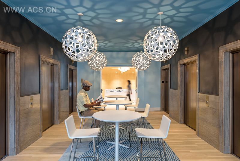 水是一种不断循环和转化的元素,Blitz 便采用了水的理念,并参照挪威最大的河 流来设计空间。格洛马河从北边的冰山上流淌下来,穿过农田,流到南边的小城市中央, 它流经了挪威不同的地形区和生态区。同样,融文办公室也有一条从办公室到各部门 区域的主流通线。Blitz 从格洛马河流经的生态区中挑选了 4 种元素,包括冰盖、瀑布、 山谷和池塘,来区分办公室中的各个空间。