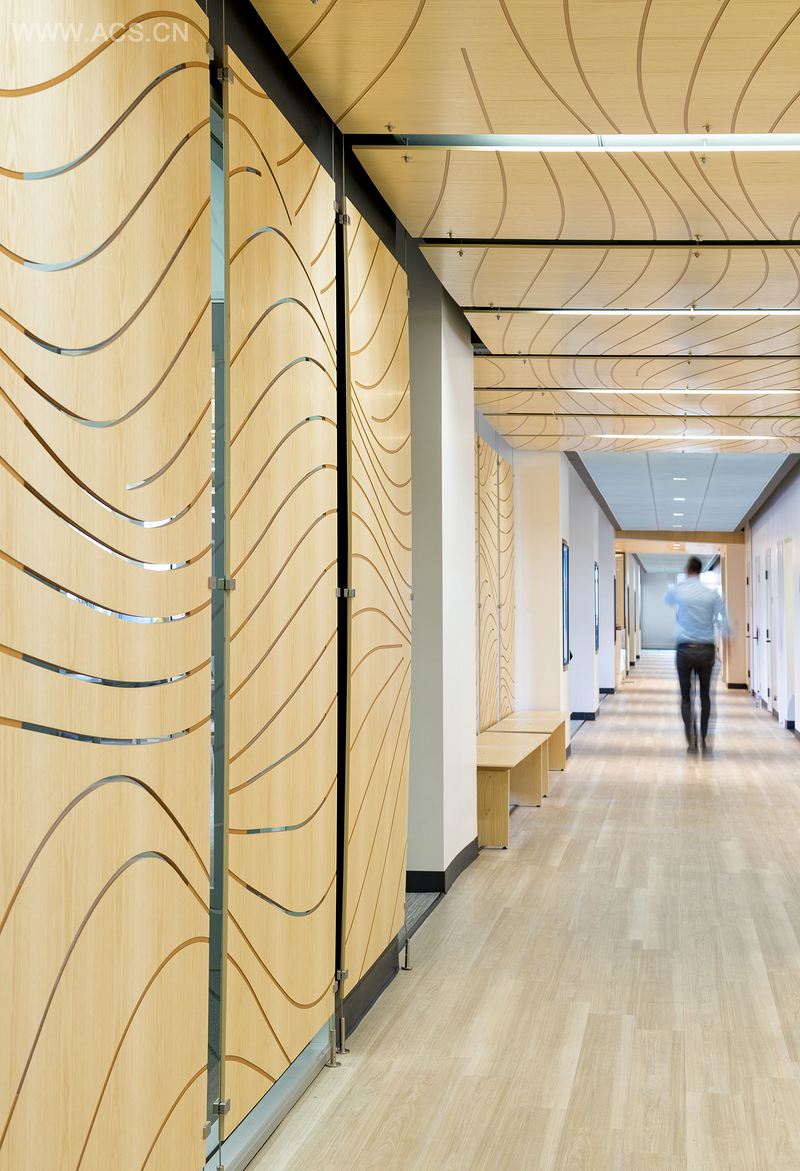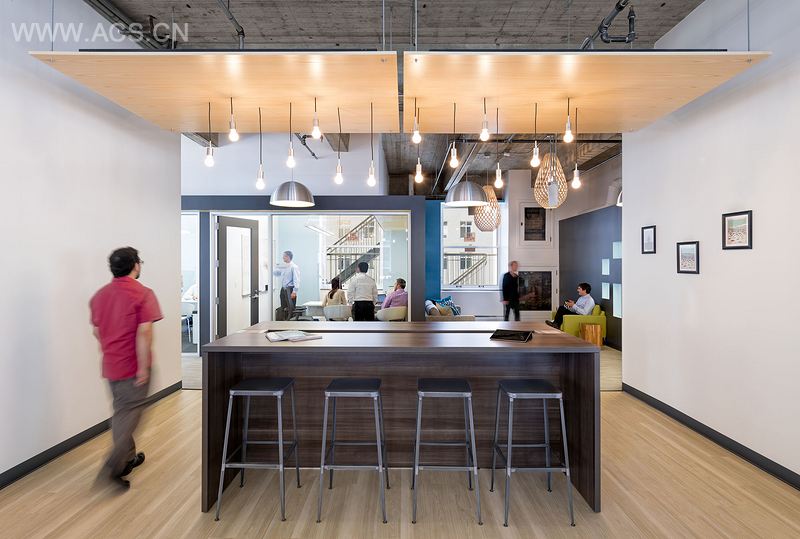 除了富于转化的水以外,Blitz 的设计继承了斯堪的纳维亚建筑的传统,赋予了空 间整体性,也让人联想到公司的历史,此外,还与旧金山科技进步的背景相契合。统 一的用材方案将不同设计方案的空间组合成一个整体,例如暖色木。鲜亮的色彩不仅 突出了公司的传统,还让传统与时俱进,形成旧金山风格。整个设计的另一个关键点 就是私人办公室的透明度,这不仅有利于自然光照入空间,更有利于促进合作。建筑 师在所有的办公区都装上玻璃,并用悬挂的木板把玻璃包裹起来,从而让自然光自由 地照入空间。墙壁上刻有抽象的挪威旗帜,将新办公室与融文的根基巧妙地系在一起, 具有经典的北欧现代风格。除此以外,Blitz 在多余的空间内加入了一道乐高墙,既给 空间增添了一种多变感,也鼓励改变传统的会议空间。触屏显示器、最新的音响系统 和高清投影仪让项目更加完善,巩固了该项目在旧金山科技中心的地位。另外,空间 还能不断满足公司的发展需求。