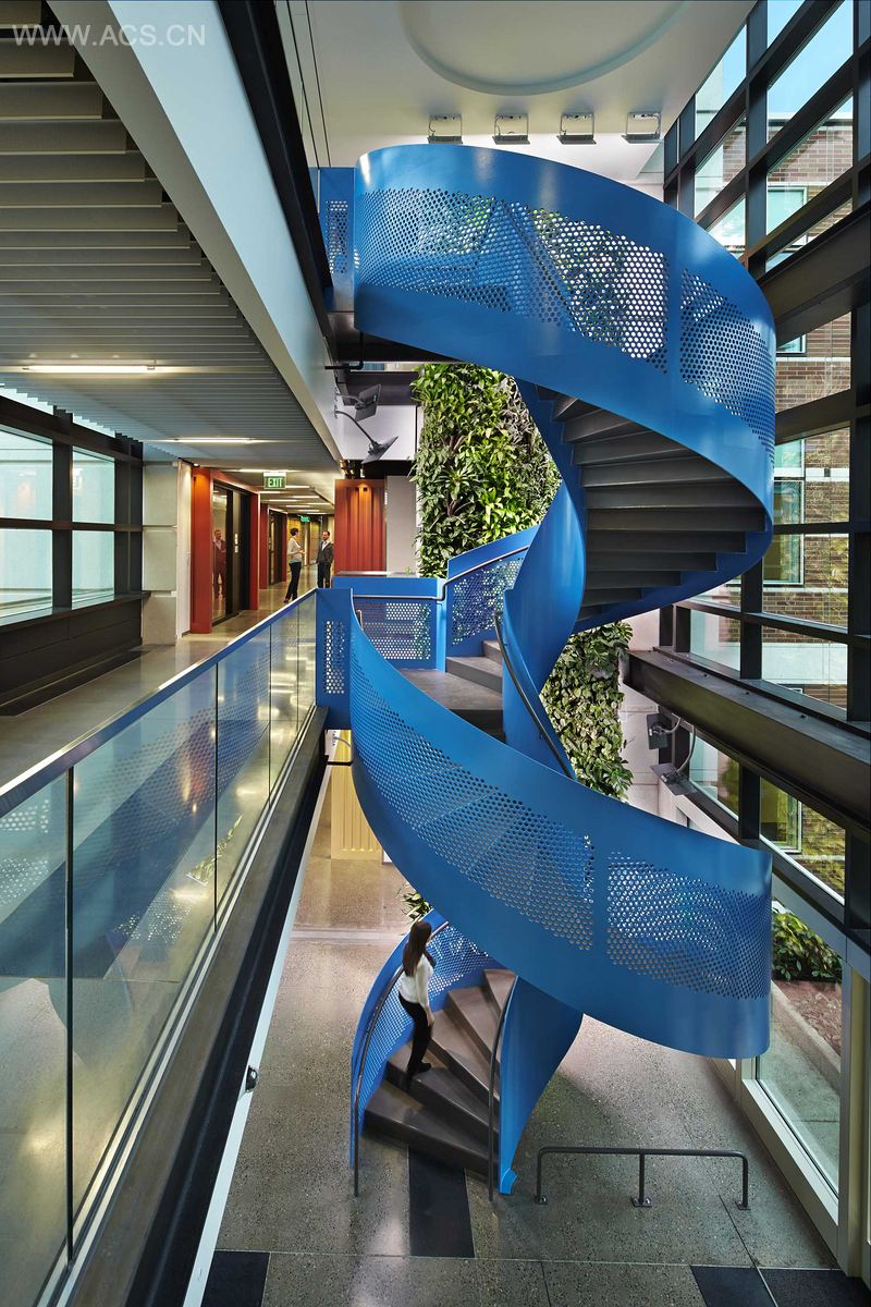 该办公楼分为三层,面积约为 14 679 m2,坐落在华盛顿雷德蒙微软主园区中, 建于 20 世纪 80 年代。本项目是将这栋微软 44 号楼进行翻新设计。办公楼的规划 和设计理念都符合了微软优化工作项目 2.0(WPA 2.0)的要求,旨在营造一种能 满足职员需求和推动业务发展的最佳办公环境。微软对此展开了调查,并发现职员 在个人办公空间中花费的时间其实很少。为了实现办公室工作区流动使用的模式, 设计中加入了各种合作空间,并减少了独立工作空间。