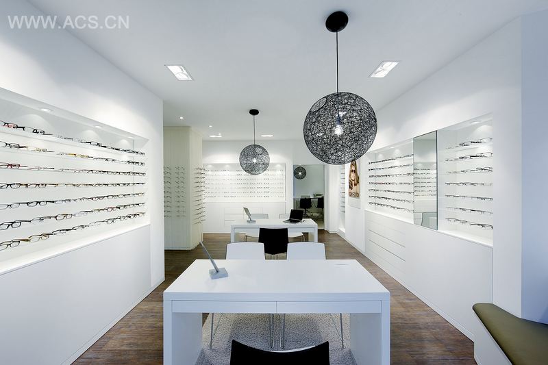 一部分折射光和工作室里的窗户通过延长视野中的场地,使其看上去变得格外宽阔。同时,通过展示的家具艺术性摆放和吊灯的平移排列,最终形成了这些独特的视觉效果。这使得站在不同位置的顾客会发现这间房间非常不同。结合软线窗帘上的眼镜展示,使每一副眼镜的特性都得了体现。