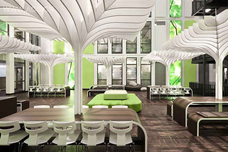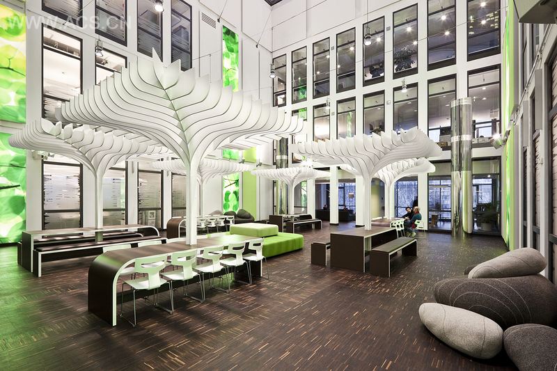 新办公区拥有更多的移动空间,多样的私人休息区,具有同等的独特性,更好 地平衡了生活与工作。不管是在公司厨房,还是在蓝色休息区,或者是在品牌花园中 的独特树叶华盖下,工作之余可选择的休憩地点总是数不胜数。喜爱乒乓球和桌上足 球的人们当然会聚集在运动休闲室。抽象的树冠和各种单独摆放的座椅,以及门厅处 材料的选用,都反映出独一无二的企业设计。悬浮于空中的树叶大灯、“垂直绿色” 空间,以及诸如充当独立座位的石头之类的细节,点缀了空间,让这个“花园”更加 完美。