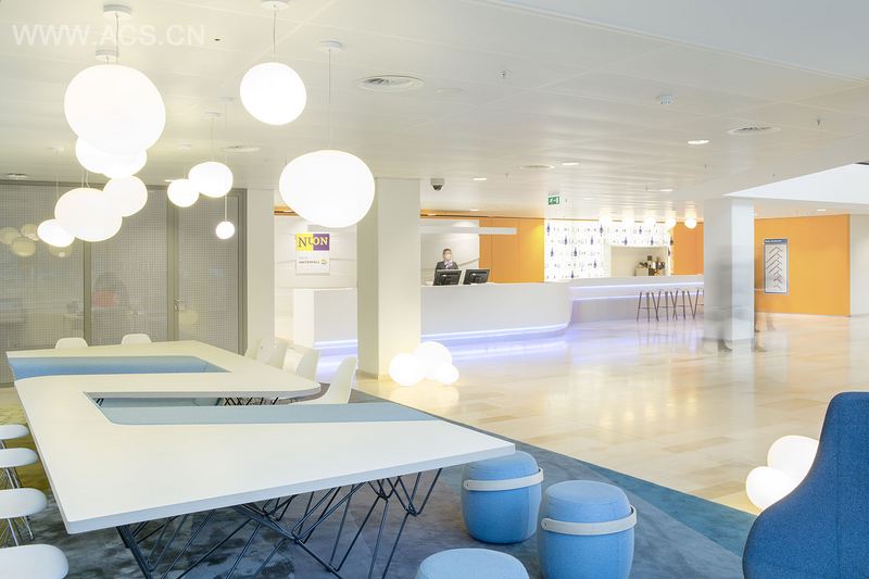 2012 年 9 月,HEYLIGERS d+p 建筑设计机构接受了为 NUON 设计室内空 间的合同,在短短的 15 个月后,新办公室便投入了使用。新总部适应了“新工作方 式”,移动办公:完全开放、极其灵活的办公环境。 室内设计了开放办公楼层,设置了多样灵活的办公空间,此外还穿插了会议室、 电话间、单人工作区、食品室、“行政套房”和项目策划室。建筑为使用者提供了多 样化的设施,包括接待大厅(带有水吧)、餐厅(可容纳 650 人)、图书馆、浓咖啡吧、 服务中心、会议中心以及空中酒廊。