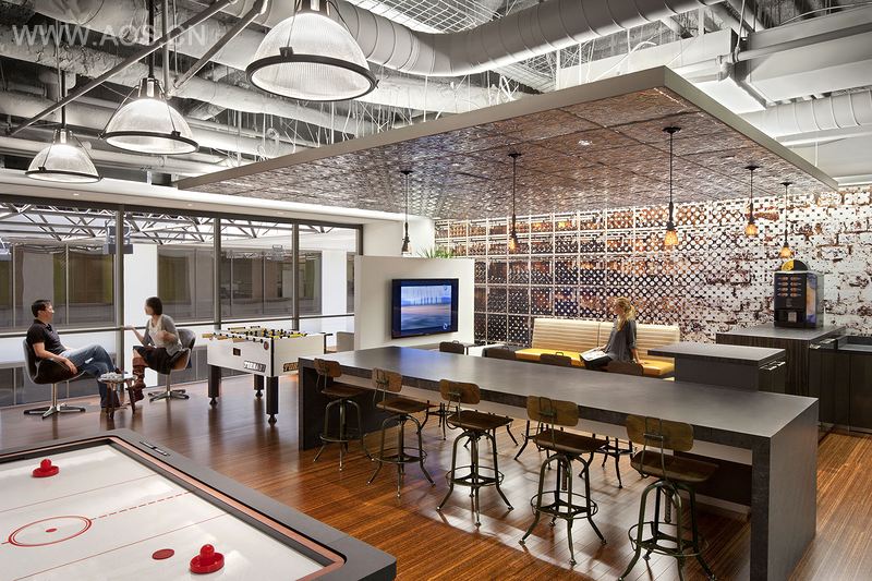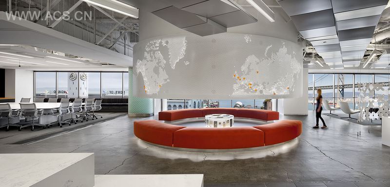 Velti 是全球领先的移动营销和广告公司。该公司希望新总部能重新诠释现代办 公空间动力学,这就意味着为员工创造一个灵活的办公空间。新总部设在旧金山金融 区斯图尔特大厦的第 6 层,面积约为 3 530 m2,其位置优越,视野开阔,能观赏到 轮渡大厦和旧金山海湾的风光。空间内包含了各种公共空间,适合各种互动工作场合。 办公空间的外观和触感不仅迎合了 Velti 公司的 200 名职员的品味,还能适应各种各 样的工作模式。该项目涉及办公室、餐厅设施、展厅、公众聚集空间和职员休闲区(也 叫做酒馆,内设电子游戏室、照相亭、酒吧和游艺室)。空间内摆放的小桌子适合亲 密的交谈;大桌子适合大型正式会议;露天阶梯空间适合举行公司会议;移动分区则 最适合单独工作。精心规划的流通线路、可伸缩墙、充足的自然光线,以及各种正式 和非正式工作空间,使得办公室成为了一个有形的社交网络。会议、社交和工作空间 的布局十分巧妙,就像一个分部的领域体系。营销人员、工程师、执行董事、IT 人员、 产品开发人员和内部法律顾问都可以在这个体系中单独工作。色彩、图案、家具和墙 饰组成了清晰的美学语言,将每个部分分隔开来,赋予每个团队个性。而裸露的混凝 土地面、多层次开放天花板、专门打造的超大图案以及醒目的纹理和图形,贯穿了整 个总部,并将各个部门连接起来,为这个重视协作和创新的办公空间奠定了基调。