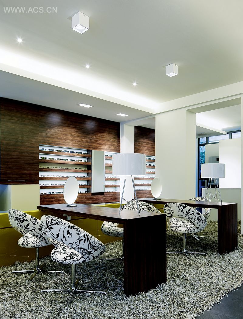 米黄色和长绒头地毯把咨询区和用板岩铺的走道相隔开。深橄榄色的西班牙木头制成的全高支架呈现了结构化的眼镜框类型。