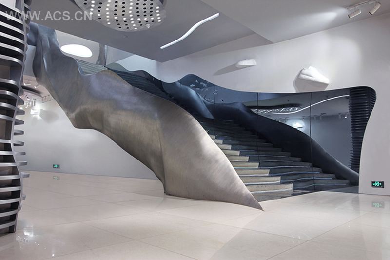 流动的拉丝不锈钢双曲面造型包括门头、柱体、楼梯、扶手等贯穿在整个空间之中,楼梯扶手则是是整个空间中的亮点。设计师设计出抽象而充满艺术的形态,由设计师脑海中对设计的构思到电脑中的设计图纸、到3d打印、工人翻模、最终由雕塑师傅纯手工敲制而成,形成如此连贯而巨大的造型,充满了神秘感和吸引力,震撼无比。