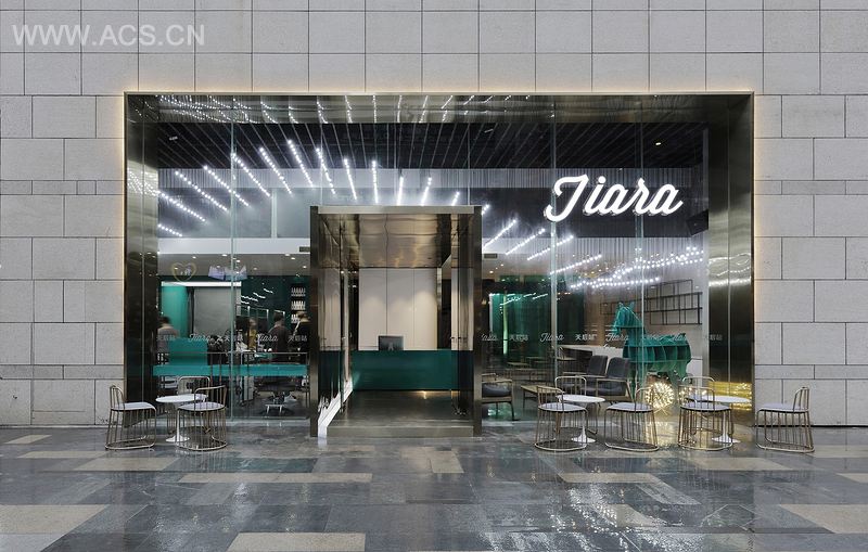 形象门面巧妙的保留原建筑粗犷的火烧面花岗石表面,使用超白玻璃、香槟金不锈钢等细腻的现代材料,形成强烈的对比,并把入口安置在一个巨大的金属盒子里;而在摒弃传统美发店三色旋转柱标识的同时,挑空区那片发丝般飘逸的阵列灯泡,柔化其外观硬朗的气质,让空间变得立体而又动感,用强烈的视觉感受来体现美发的行业属性。