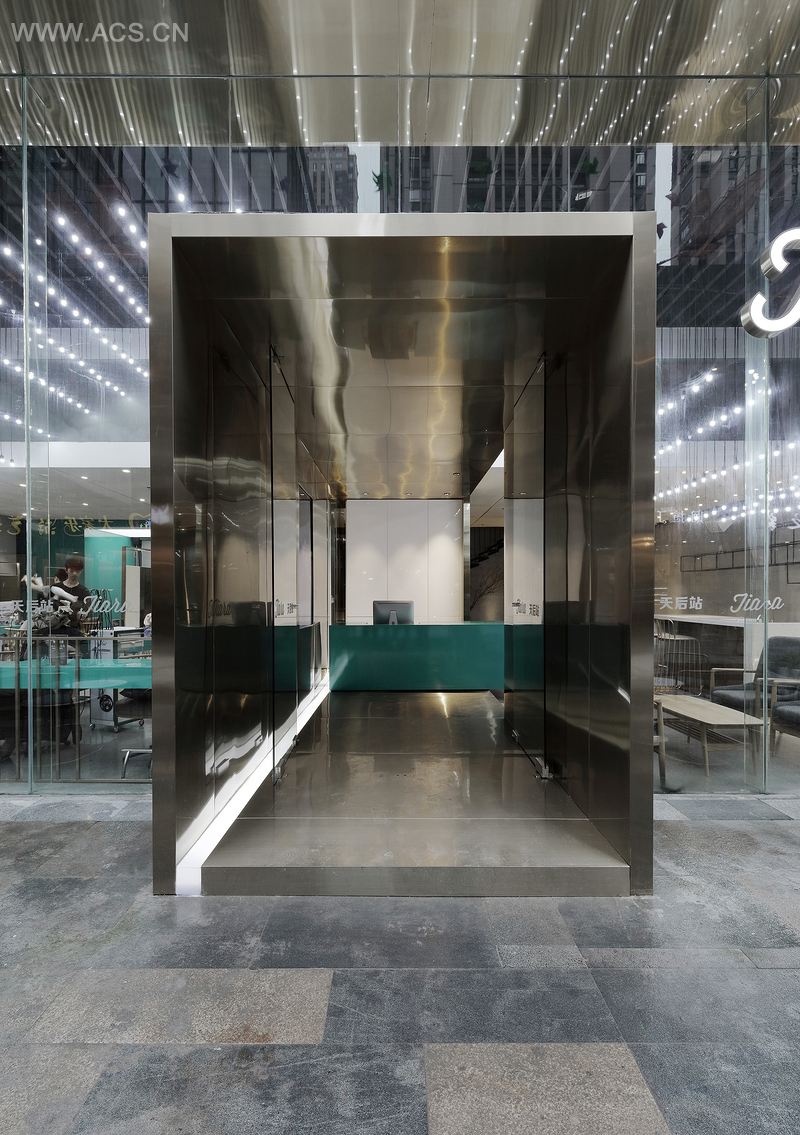 源自于服装T台、香槟金不锈钢包裹的狭窄入口走廊,地面的光带散发到金属板表面的反射,营造出未来时尚科技感的光影,配合着走廊无限播放的时尚秀场画面和音乐,心情随之澎湃起来;沿着T台走到那抹指引动线的蒂芙尼蓝极简收银台,转角进入淳朴的休息区空间,大有桃花源般豁然开朗的感觉。连接各区域之间的吊顶用钢板拉伸网材料,把天棚管道线路给掩盖掉,既延续了粗犷的质感,又流露出对细节的细腻处理。