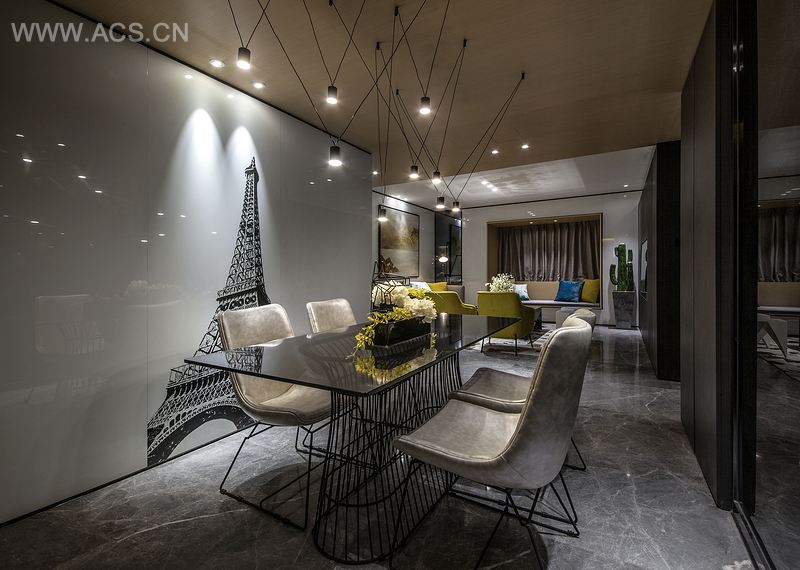 整体空间的动静区域规划分别以黑白色系来区分。黑色是谧静,白色是纯净,过分的纯粹反而让空间感觉到冰冷,甚至会令人产生距离感;而家是有温度的空间,所以在追求时尚感的同时,选用代表着希望和朝气的黄色系,对空间环境进行调剂。