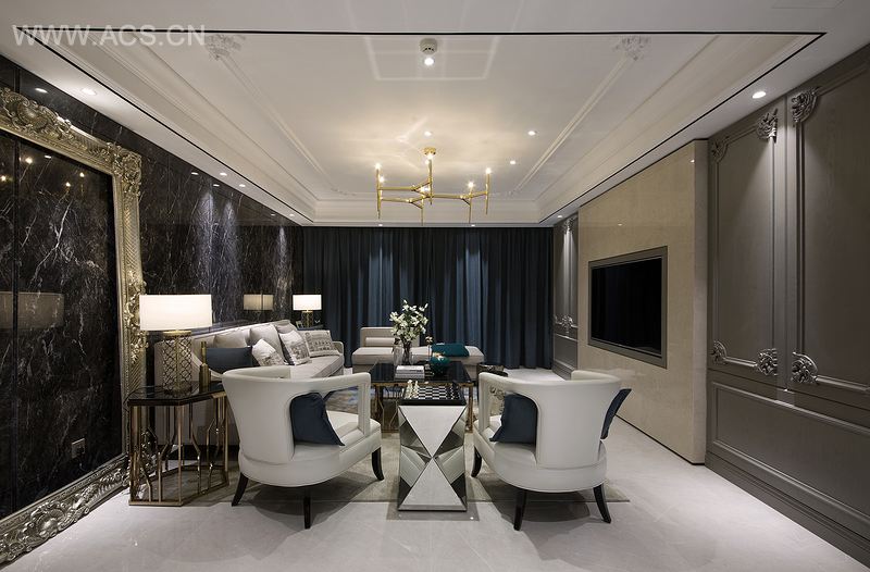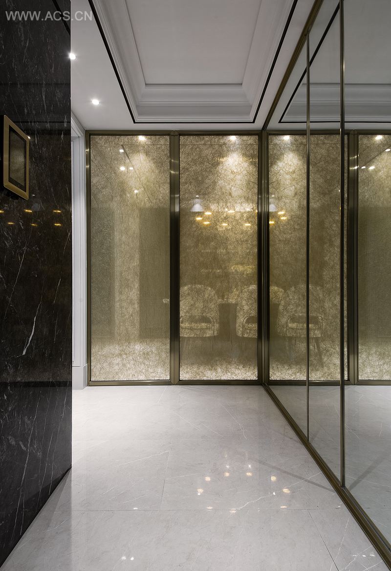 主要材料:意大利啡网大理石、象牙米白大理石、灰色聚酯漆、香槟金拉丝不锈钢、进口墙布