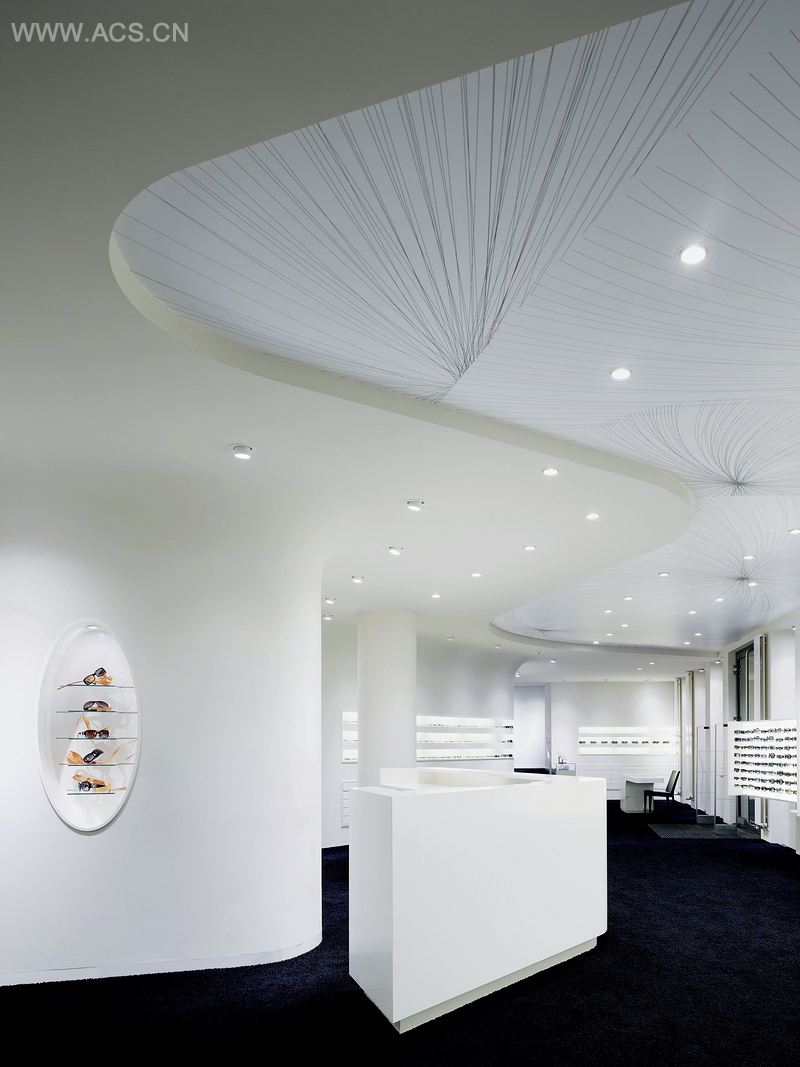 该空间柔和的轮廓规划出一个完全开放的视野,同时,还划分了许多个个人区域。这些个人区域把生产线划分为男性用眼镜、女性用眼镜和儿童用眼镜。这些眼镜摆放在三个嵌入的平面上,几乎布满了整个墙壁。精密的前后照明为这些眼镜制造了一个极好的展示空间。泛红的储藏空间在展示平台下面,用于储藏整个生产线的产品。