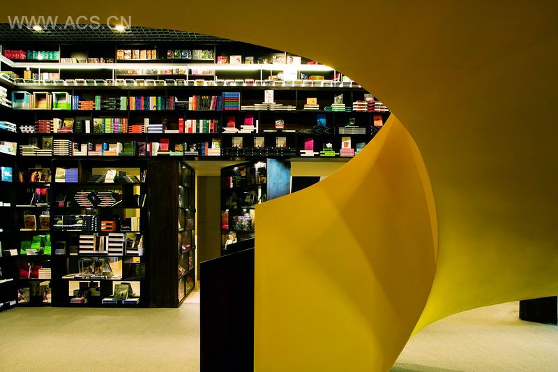 顾客在一楼可通过旋转的窗架门进入书店。顾客从右边的那个楼梯到达一楼的中间夹层,该夹层位于客厅上的边缘,与悬挂在宽广的中央区上的三个区域相连接:分别为听众席,用于举办课程和讲座;古典音乐与爵士音乐唱片区;以及用于举行新书发布会的地方。