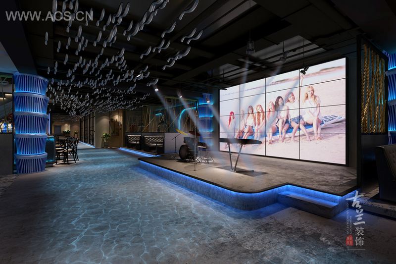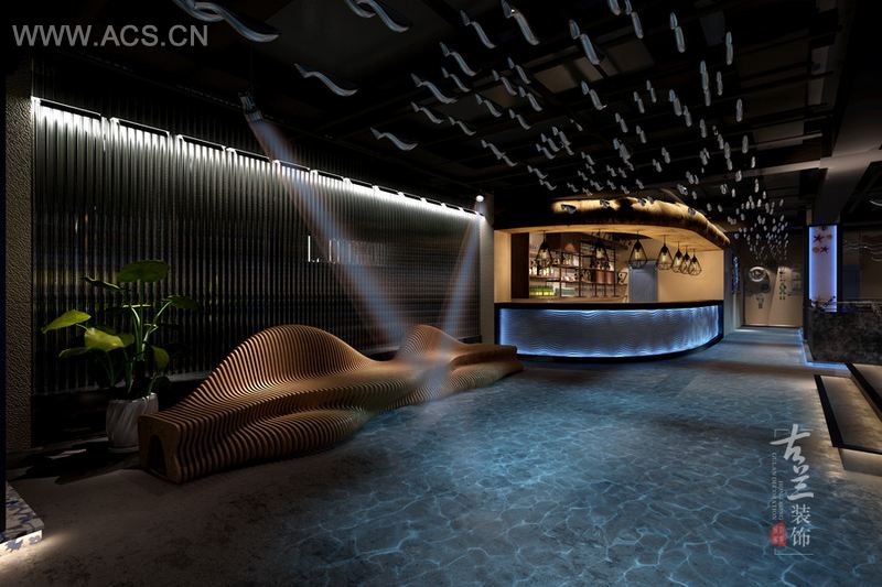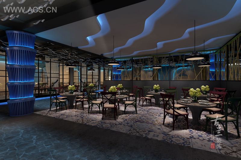 设计说明:主要以做鱼和海鲜为主,要有海洋的感觉,厨房要大,主要以工业风格为主,外加海洋元素造型和软装配饰,外加蓝色灯光和水纹射灯的运用,让客户在餐厅有种大海的感觉。
