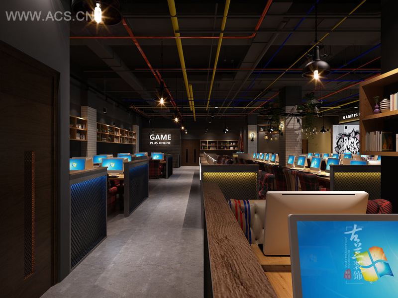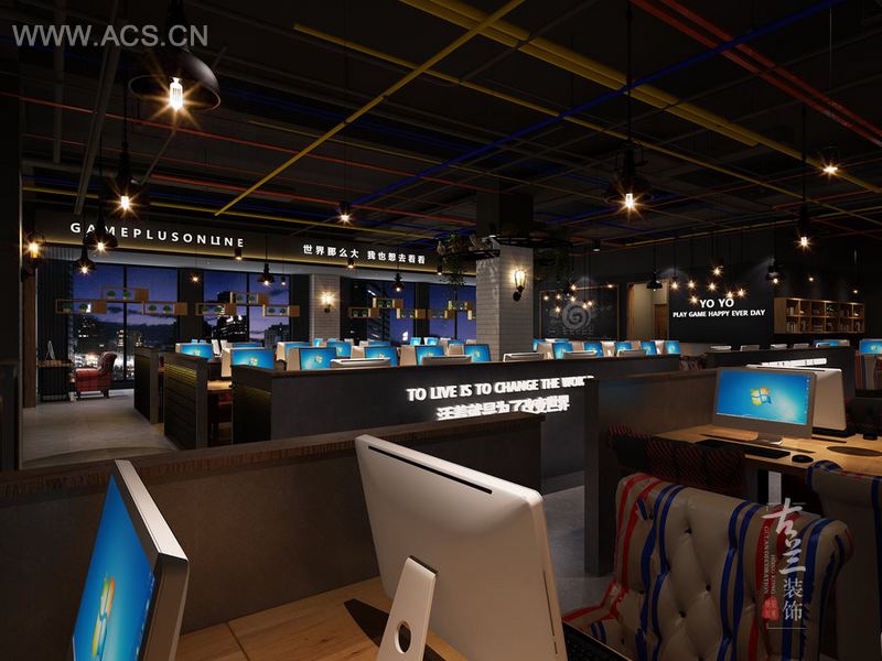 大多数网吧都是沉闷的暗色基调,但是这并不是通用色,颜色会影响到消费的玩游戏心情,色彩影响情绪,游戏区色彩可以火爆些,而聊天区色彩应简单明快、温和一些。网吧在颜色的搭配上一定要贴近消费的心情,把握简洁、明快、恬静的特点,无需刻意追求奇特与高格调。只要舒适就好。