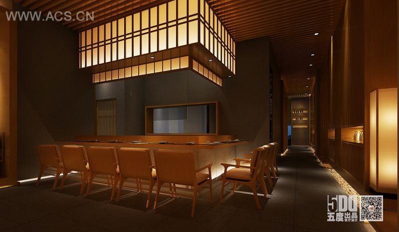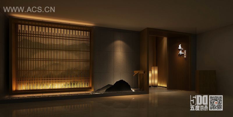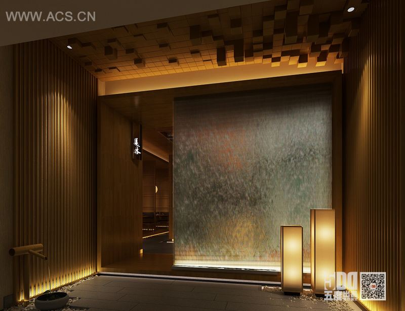 一盏清酒,一池春水,心似涟漪,春丝泛起。餐厅设计以“水”为主题,结合现代设计手法,采用原木,原石,和水的结合,打造体现“侘寂”美学的现代餐厅。“强调艺术的内在美,犹如日料中的对食物本质的精心挑选,呈现出事物原本的内在美 。餐厅门头处,映入眼帘的是枯山水景观,体现了侘寂美学中的“不完美”。但却给食客一种期盼,在不完美中去发现餐厅的美。