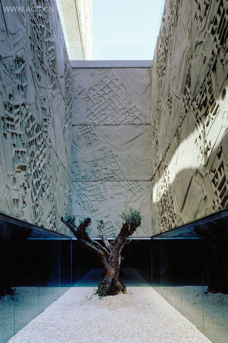 建筑外围所用的材料及其运用值得一提。他们不仅有效地构造了建筑的外形,也是项目主题的基本组成部分。从外面看“被掏空”的坚固大型空间实际上是用调整型钢筋混凝土结果框架建成的,其表面覆盖了大块的预制混泥土面板。