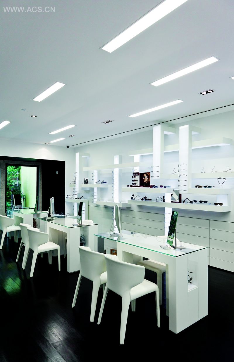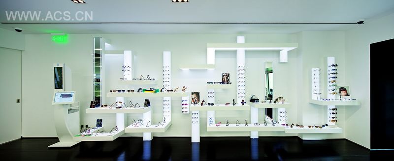 展览元素促使我们使用钢铁和树脂玻璃来建造垂直、水平的棱镜。水平的棱镜具有多种用途。如果水平的棱镜朝向上,那它是用来摆放眼镜的。如果是垂直的棱镜,可以通过支撑鼻托来摆放眼镜。如果是水平朝下的棱镜,则摆放灯具。