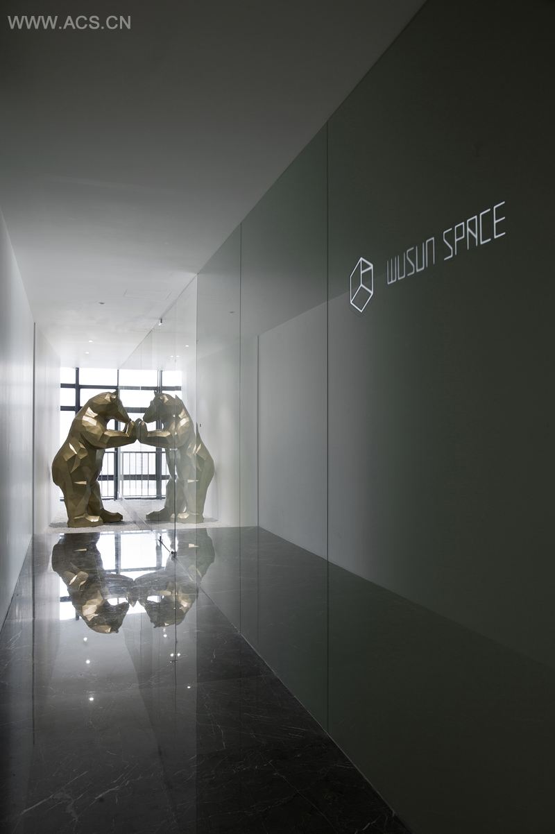 一道光门,隔开了外界的纷扰,拾阶而上,映入眼帘的是一头金色的熊趴在玻璃上向内窥望,这是致敬艺术家Lawrence Argent在美国Denver Convertion Center创作的蓝熊,它的趣味性打破了走廊的单调。