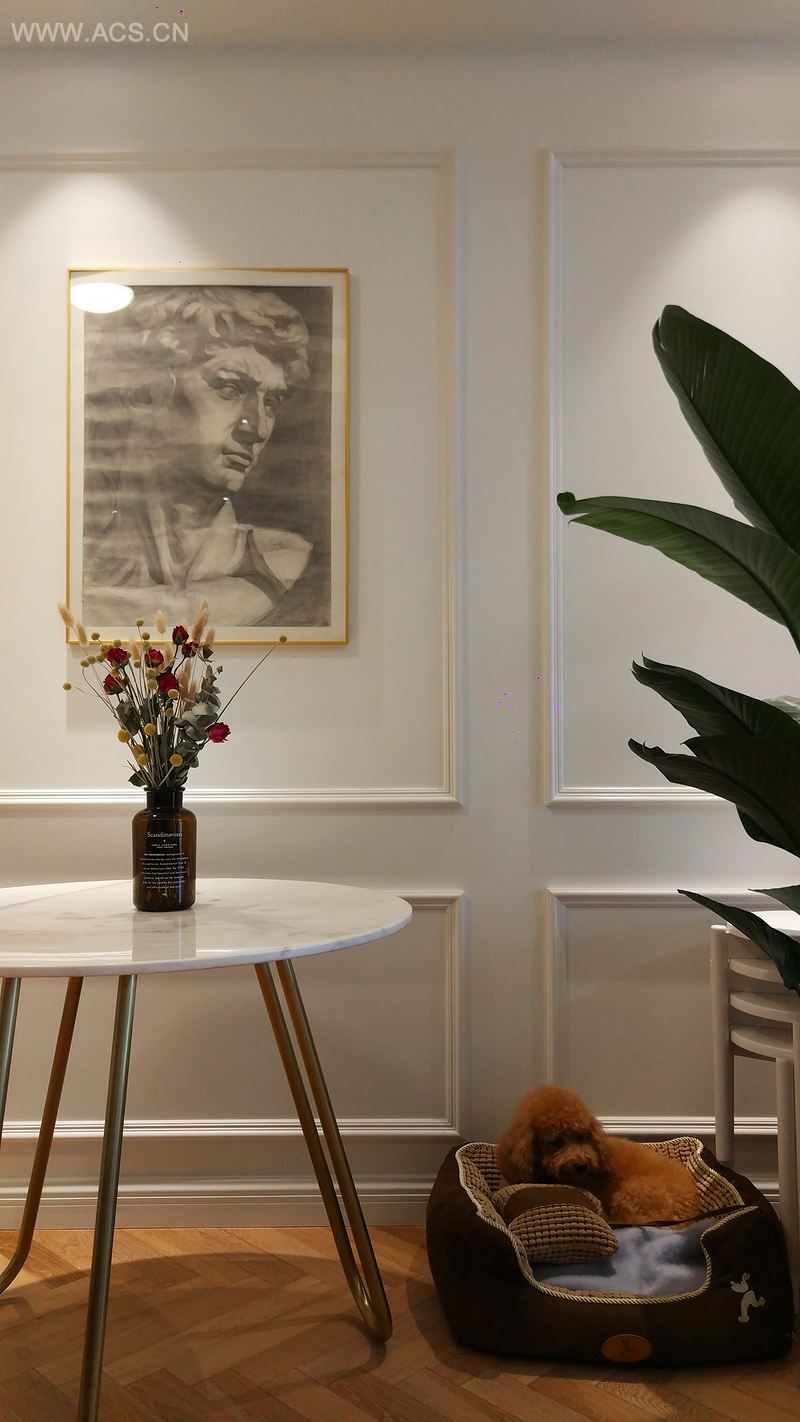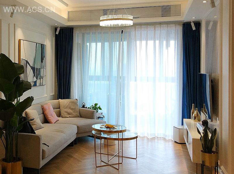 简约的家居空间,用简单的直线条来描述整个空间,白色、木纹色作为主色调,金色和钴蓝色作为点缀色,是空间的明暗对比和色彩对比达到和谐而又有层次,地面用的瓷砖拼接实木地板打破了传统的拼接方式,空间的颜色和气质都营造出轻松奢华的气质。