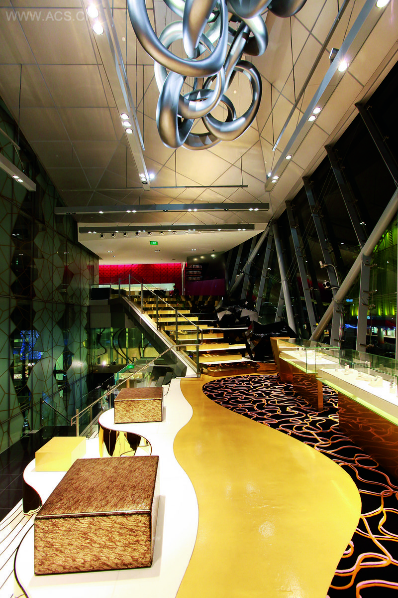 从第一分钟开始,人们会感觉到他们进入了未来世界,尽管有机的空间是用大胆的金色、银色和黑色的细节来填充。“360个椭圆图案”与独特的珠宝一样,吸引着人们的眼球。这个多层次的空间分成不同的部分,突出了珠宝购物的不同特征和体验,但流水行设计使这些部分变得模糊,而且还完美地将顾客从这个地方输送到另一个地方。一楼的金色波状楼梯在设计上具有平台,使人们能够停留在不同阶梯上,并从不同角度来观看珠宝。所有珠宝通过不同的定制展柜来分类,这些展柜都非常特别,如金色的陈列柜、高光的黑色翻面展柜, 以及二楼的金色椭圆展柜。此外,定制的四米宽雕塑的形状就像相互缠绕的铬合金手链或者说是戒指,悬挂在天花板上,从室外来看,它极其引人注目,同时还填补了十米高的空间,使该建筑不会显得过于空旷。该店的另一个值得强调的地方是该店在二楼设置了酒吧和休息室,在那里,贵宾可以在购物的同时,尽情地享受一杯香槟。他们甚至还可以在一个特殊的区域里倾听特邀DJ所带来的音乐。