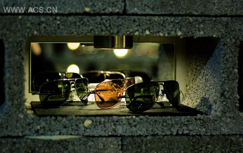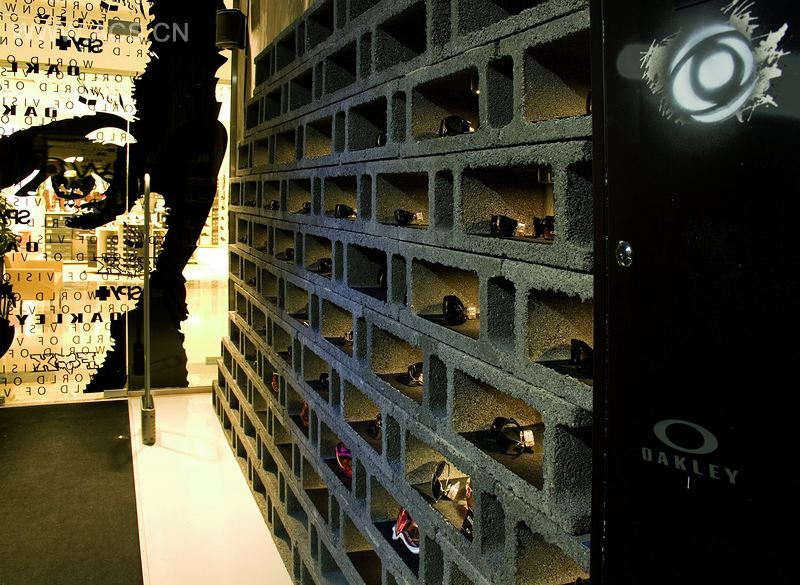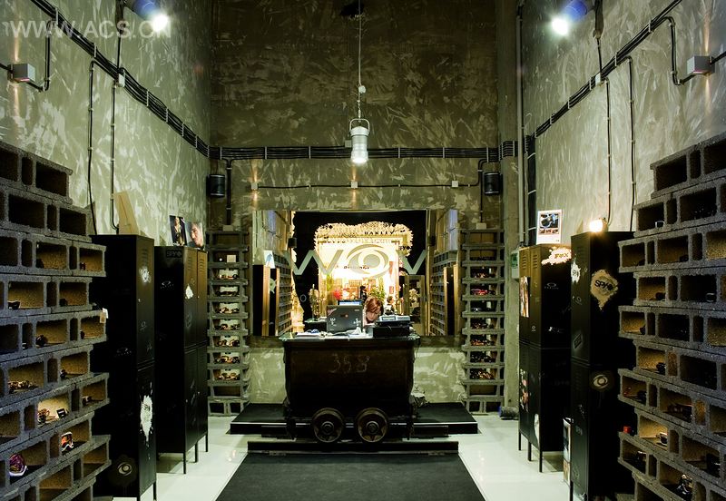 该店的室内理念是根据矿井来设定的,从而产生采矿太阳镜的哲学。这个理念应用了一个幽默的对比。佩戴此太阳镜可保护眼睛、并可在漆黑的环境下进行采矿,以及在工业区中使用。太阳镜被放置在墙壁上的洞孔中,从而充分利用了墙壁的结构,而桌子则是古老的采矿车的变换版本。陈列柜和工业用吊灯也被用在这个开矿的环境里。座位在这个项目里是经过特别设计的,其设计灵感来自于钢框架和钢结构。商店窗口展示了一个巨大的面部图像,上面写着许多你能够在店里找到的品牌的徽标。