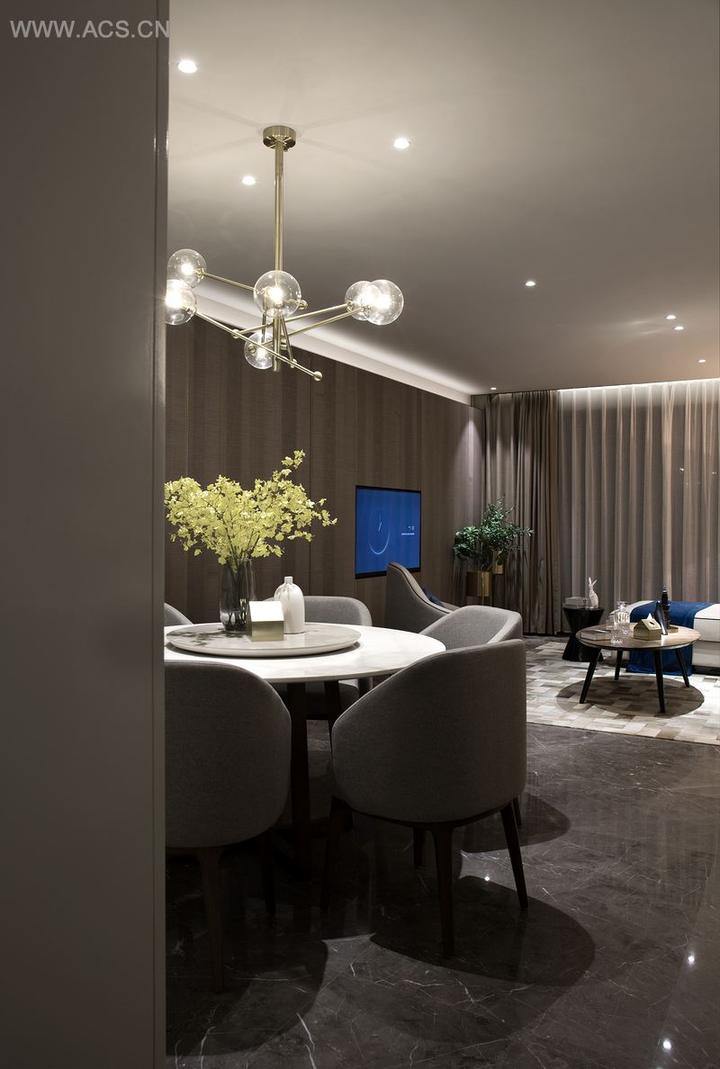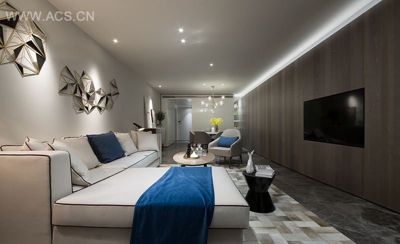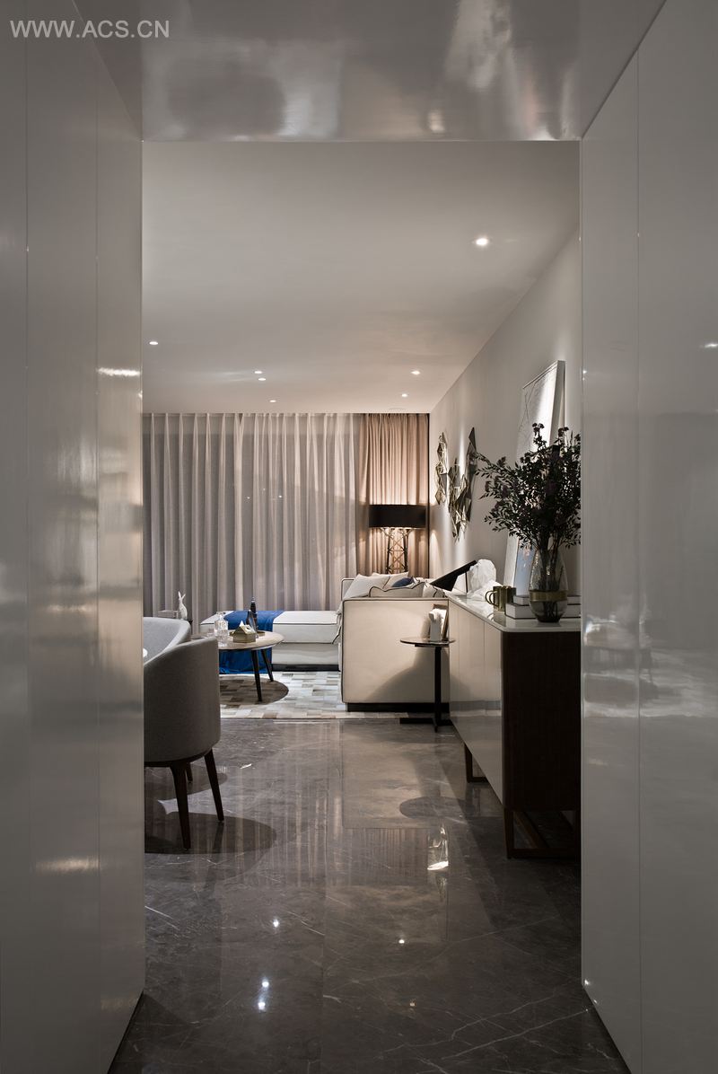 以电视墙隔开活动区和休息区,为了增大活动区的视觉空间,活动区的门全部以隐藏的形式。从客厅往厨房方向看,玄关和厨房融为一体,形成一个白色的盒子,成了这个空间的视觉焦点,而活动区的所有空调设备全部隐藏在白色盒子内,最大限度的抬高客厅及餐厅的层高,避免压抑。