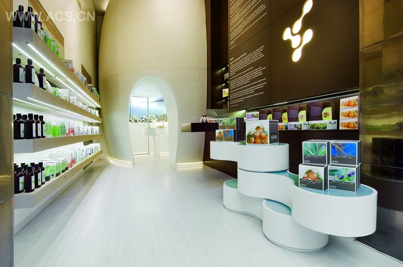 本案寻求的是纯净自然的设计。这家时尚精品店的设计面临着严峻挑战。它的设计是典型的“戴着枷锁跳舞”。Minusplus的设计师不得不在狭小的空间内分配三种不同的功能。最后呈现的店面既通风良好又有较好的亲密性。该品牌所需的设计元素如DNA图案墙或化妆品成分展示,很好地补充了明亮而形状像美容胶囊的空间。