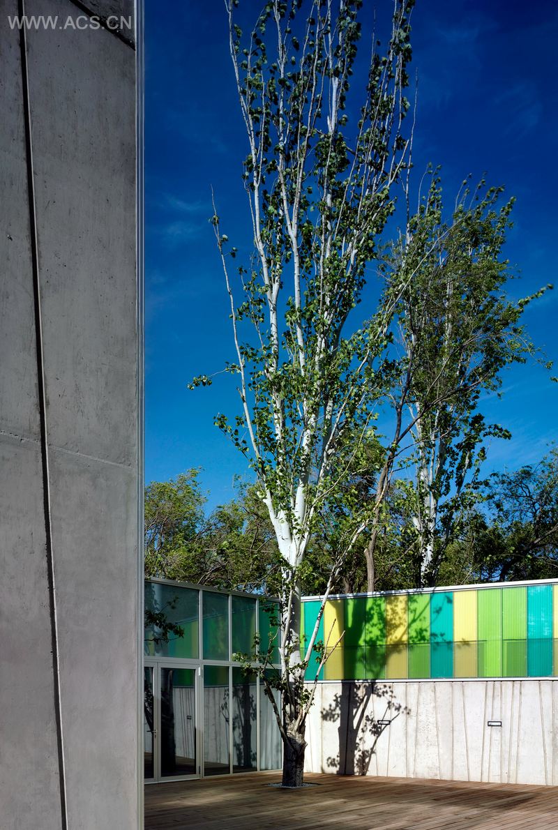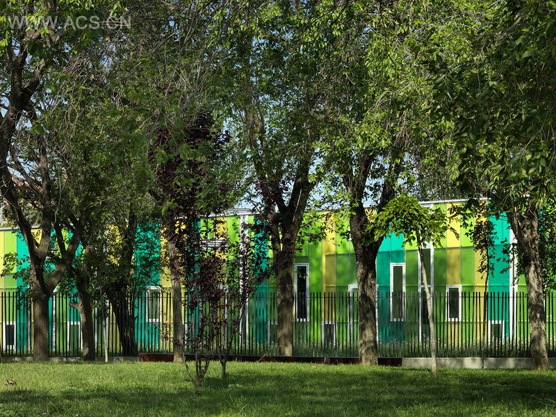 这栋托儿所座落于一个广阔的绿色空间之中,随着四季变化的树木风景尽收眼底。地板被纵向地划分成两部分:服务区,傍着露台,树木与大楼构成一个区域;教室区,面向花园,采光很好,但又被保护起来不受大风侵袭。 教室楼外墙上的白绿相间的树脂外皮过滤了一部分直射光,既保持了温暖又避免了阳光直射。这种材料能帮助人们提高对到光线和色彩的细微变化的敏感性。