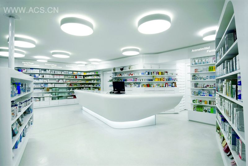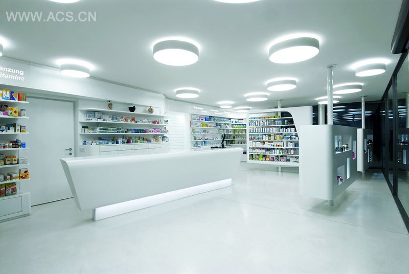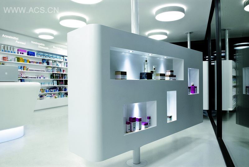 药店的店面设计很难兼具实用性和美观性。但是这个坐落于Eppan中心的新药店的设计达到了最高标准。由于药店面积有限,Monovolume必须考虑如何高效使用空间。周边货架构成了丰富的展示区域,同时使空间看起来更宽敞。它们成为了量身定制的可丽耐柜台的背景。柜台仿佛漂浮在白色大理石水磨石地面上,成为视觉的焦点。对于药店来说,Para是比较大的,因而为咨询活动和顾客自由挑选提供了空间,而独特的曲线设计则避免了它可能因面积过大而带来的压迫感。面对窗口的一边设有旋转货架,用以展示精选产品。它们特定的高度既不会影响光线进入,也不会减弱空间的宽敞感。为了引导顾客关注丰富多彩的药物,药店采用全白家具,在和谐的光线映射下,药店似乎完全隐退到药物之后。