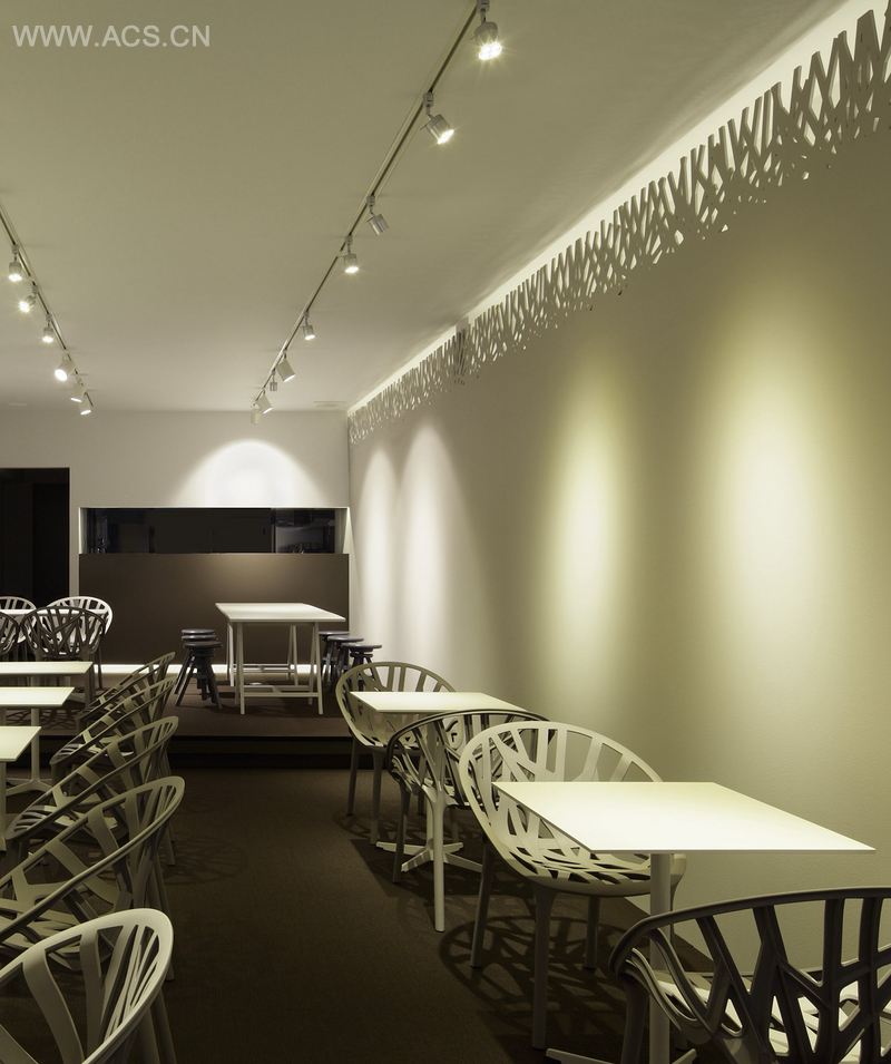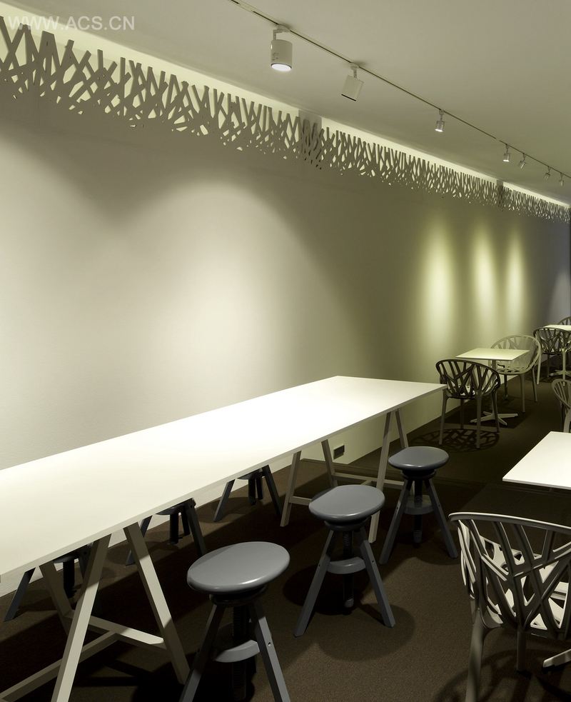 这个空间由让人感觉到温暖的咖啡厅设计与格调构成,它还通过优美的比例与细节来增添美术馆的必要“品质”。为了给整个空间营造出温暖的感觉,我们采用了抽象的鸟巢图案设计,并将这些图案元素放在了这个空间的各个角落。这些图案有一定的寓意,店主希望艺术家们能在这里像小鸟一样成长,然后学会拍动翅膀,最后飞离这间咖啡厅。这些图案由数控镂铣机切割而成,其图案的最小半径为5毫米,所以这些图案能体现出漂亮的细节设计。我们还选用了与空间的主题图案极为相似的家具,并取得了预期的多层次效果。