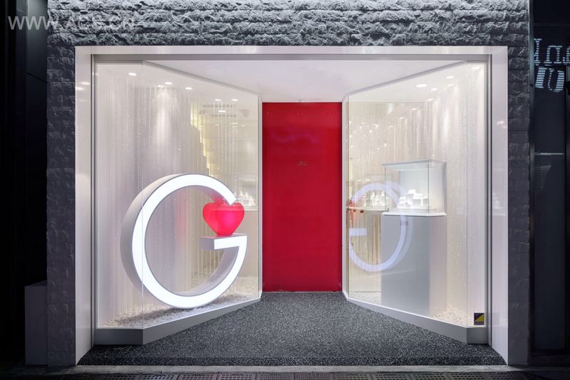 然后,在日落之后,外部使用间接光改变了表达。在这个开设这家银座旗舰店的机会中,新的图标主题是由品牌名称“G”的首字母和“爱”的“心”组合而成。然后,这被安排在入口处,作为未来品牌开放分支的标志。
