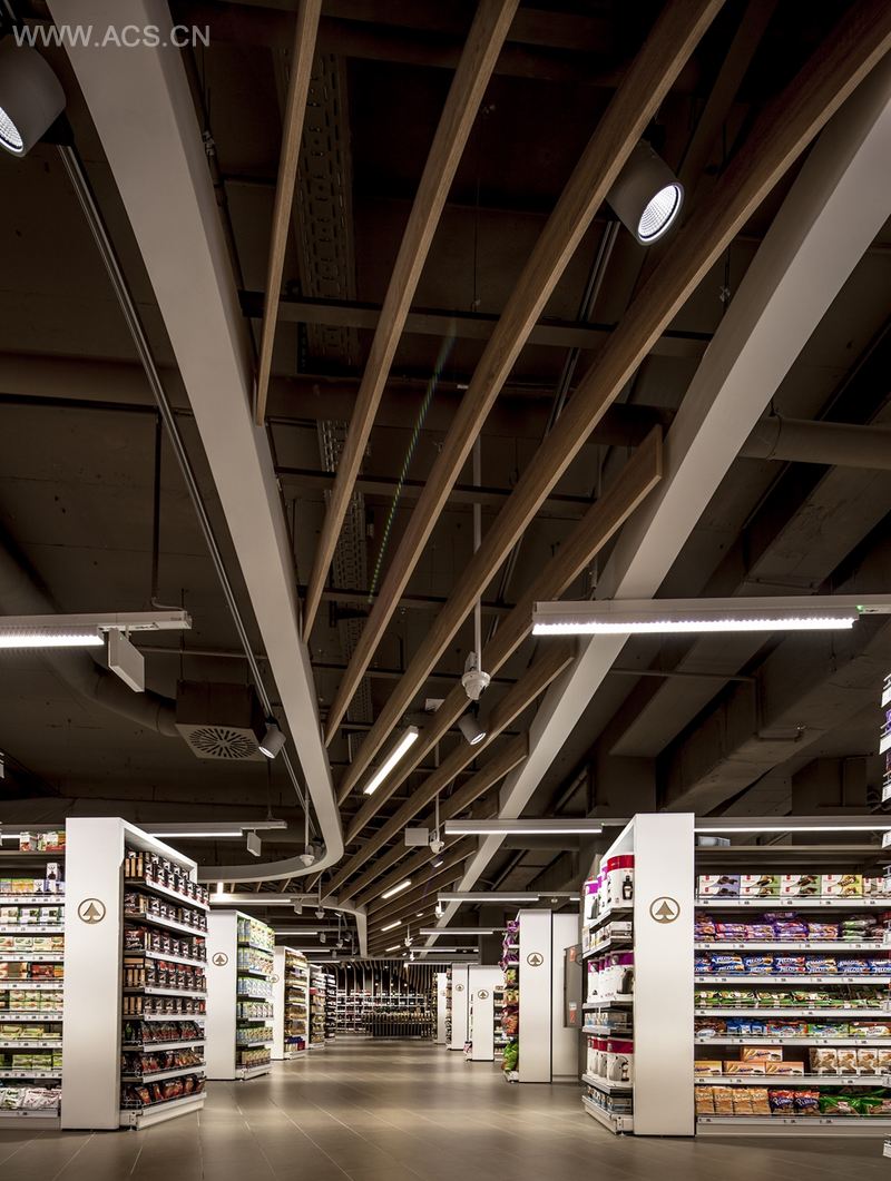 天花板引导和吸引着你从入口穿到后部区域,然后给出不同的选择路线继续下去。收银员面前的区域更像传统结构的超市,没有吊灯,结构也成常规网格状。由于内部高度中等,便想利用吊灯上方的空间,因而未装天花板,特别需要的地方则装上天花板,应用自由,被作为独立、轮廓扩大化的物体展示出来。比如哪里能使用纯白色的表面,哪里得添加元素(灯,洒水器等),哪里使用光纤天花板。