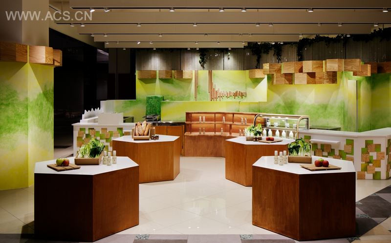 柜台和橱柜展现了牛奶的新鲜和活力,太阳和森林的精神就像色波,贯穿于空间,给空间增添了整体感,塑造了一幅充满活力的形象。