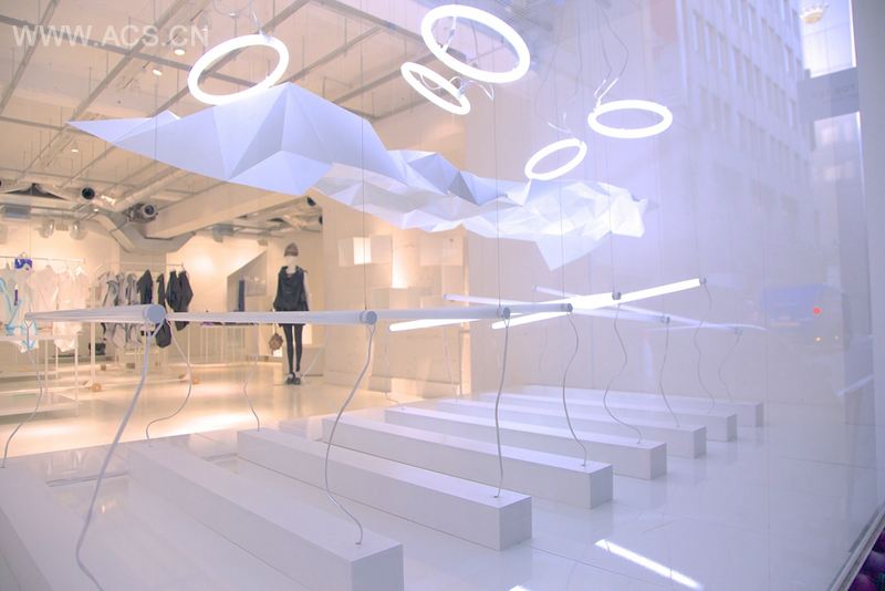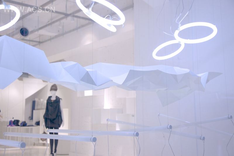 装置中央的结构代表着三宅一生(Issey Miyake)132 5.系列在衣服褶皱上的探索,以及与日本学术折纸研究员——三谷纯的合作。作品主要出发点是在空间中展示品牌理念。