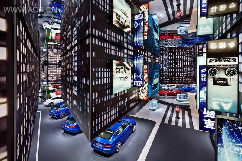 内部犹如开启了一个未来城市世界,从不同寻常的角度看:城市——移动的城市生活的象征——被颠覆了。“悬城”是通过详细的投影图像照明,共1120万LED像素,这便把形形色色的城市场景带入了生活;区域、街道和露天广场悬挂在游客的头顶。天花板和墙壁上的镜子,让城市景观向四面八方无限扩展,镜子与闪闪发光的城市灯光相辉映,营造出空间戏剧效果,给奥迪车型展示形成了专题背景。