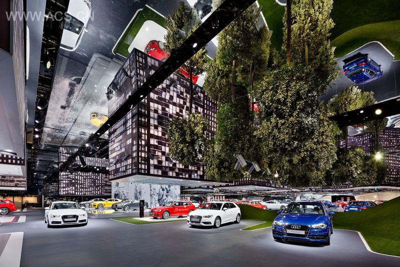 中央林荫大道和广场把游客带入引人入胜的未来城市之旅。应对未来机动性挑战的创新解决方案,显示在主题建筑的倒置屋顶。参观者可以在倒置的常青树冠下了解智能驱动系统。“技术与设计”区悬挂的大型霓虹标志,反映了城市的创造力和创新精神,也演示了联网驾驶,驾驶辅助系统和奥迪的设计理念。全球首发的奥迪全时四轮驱动赛车理念,展示了新一代四轮驱动,蕴含着奥迪生活方式和赛车本身。“奥迪矩阵LED头灯”展现了智能调光及主动安全性功能。由师莫里兹·瓦尔德梅尔设计的LED装置让新奥迪A8的全球首映锦上添花。互动展品,照片亭和艺术家帕特里克·哈特尔的“生活留言”完善了整体的品牌体验。