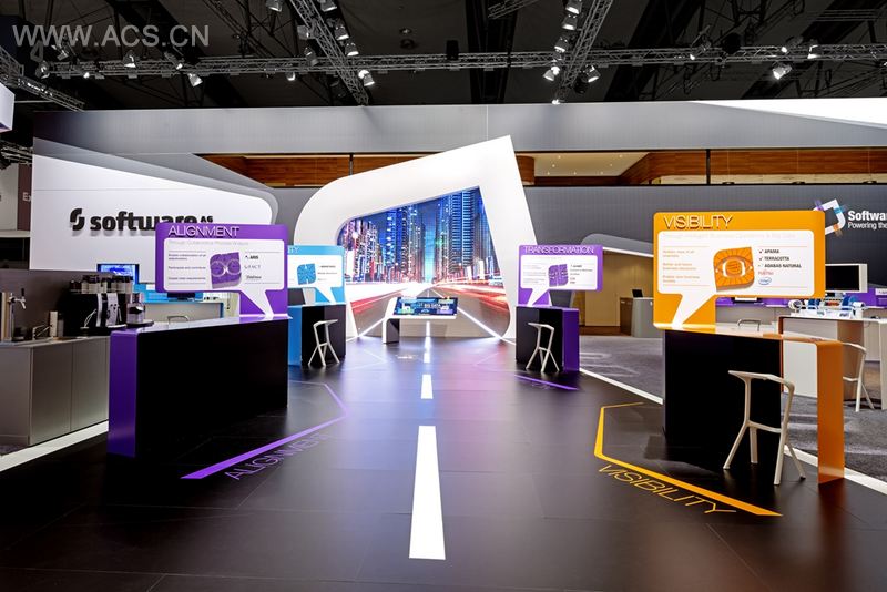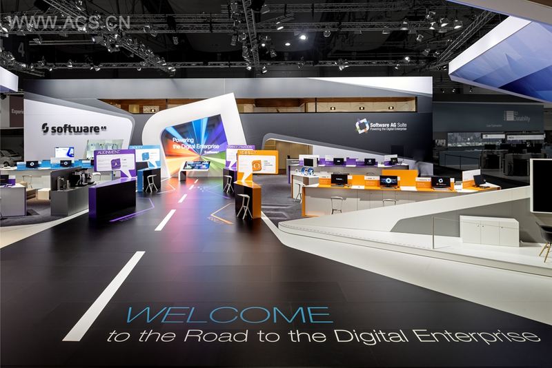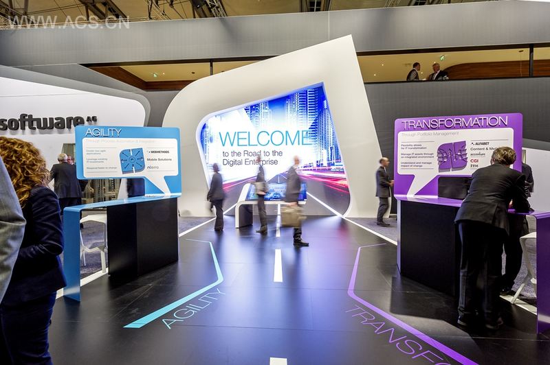 施米德胡贝树立了“踏上数字化企业之路”的传播理念,让进取心到达具体位置,让标语成了一种体验。展厅的中心就是铺设的数字化道路——一条带领参观者进入未来网络的道路。这里人与数字相遇,真实世界和虚拟世界相连。沿着街道展厅设有四个主题区:转化、联配、敏捷性和能见度,都一一被互动型展览带入生活,令人印象深刻。展台中央,数字大门指示着入口处,指向未来的数字世界。从墙脚到墙顶的大屏幕延伸到数字之路的末端,既展示了有关新通信领域的信息,又欢迎着游客进入德商塞克科技的世界。